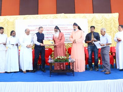 His Grace the Metropolitan presenting the Melpadom Attumallil Georgekutty Merit Award to Dr. Devi Prasad Shetty
