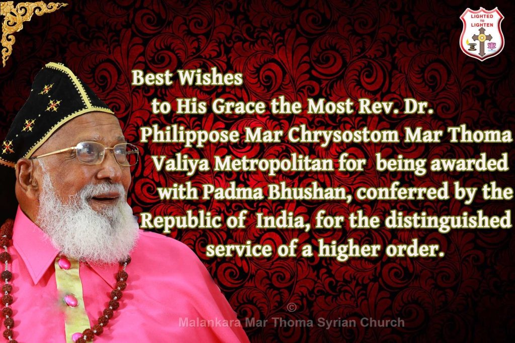 The Mar Thoma Valiya Metropolitan, fondly addressed as Chrysostom Tirumeni richly deserves the Padma Bhushan bestowed on him. As an outstanding religious dignitary with a genuine humanitarian outlook and global vision he is an embodiment of all Christian virtues with committed life. The Mar Thoma Church, the Kerala Christian community and the Christians all over India for that matter, truly consider this as an honor, fully knowing that the Metropolitan deserves even greater recognition. All who love and respect Tirumeni are elated and proud on this joyous occasion. May God bless His Grace to live many more years after completing one hundred years of age.